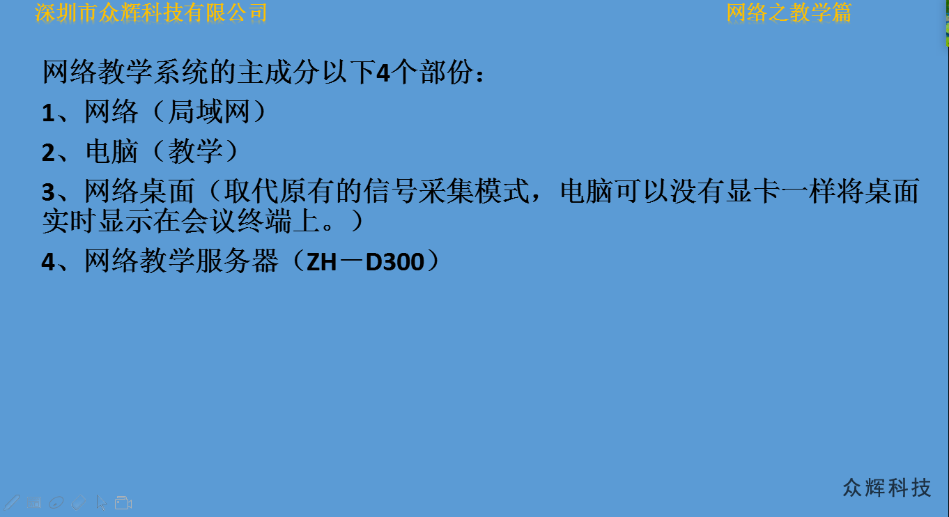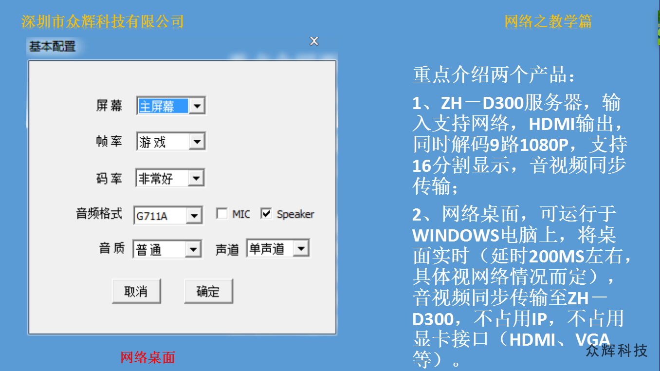 網(wǎng)絡(luò)桌面是我公司在WINDOWS系統(tǒng)上研發(fā)的一款電腦同屏軟件,只需要將電腦接入局域網(wǎng),即可完成音視頻同步在ZH-N3000(網(wǎng)絡(luò)拼接系列產(chǎn)品)、ZH-D300(網(wǎng)絡(luò)拼接處理器)和ZH-N230(網(wǎng)絡(luò)版電視拼接處理器)等設(shè)備上,實現(xiàn)液晶拼接大屏同步顯示。